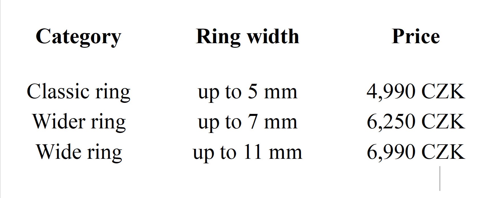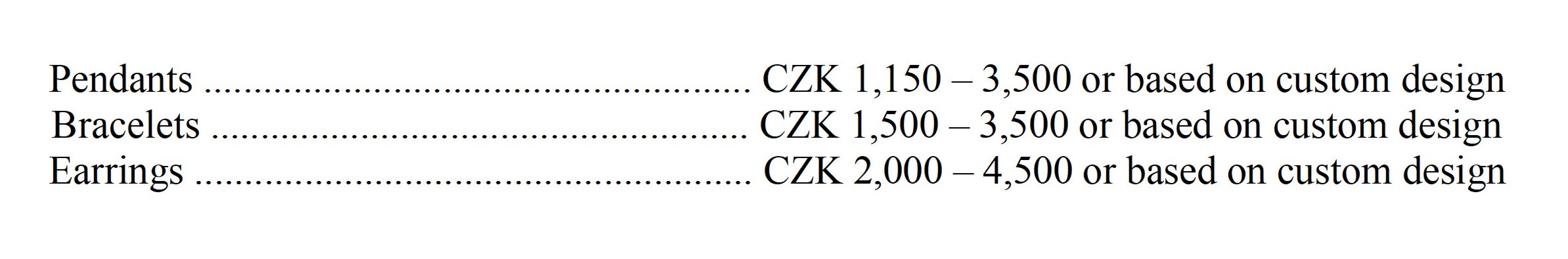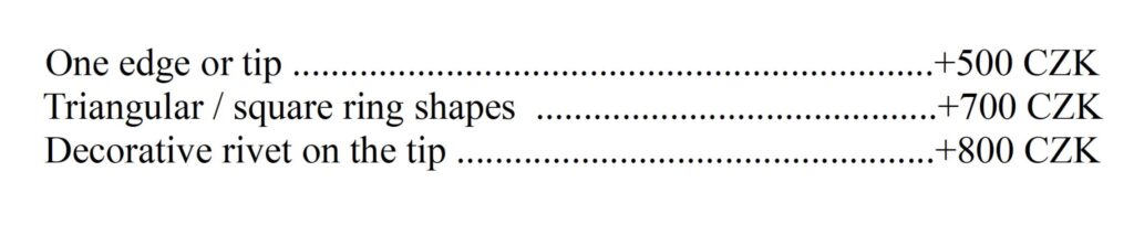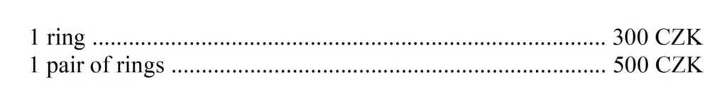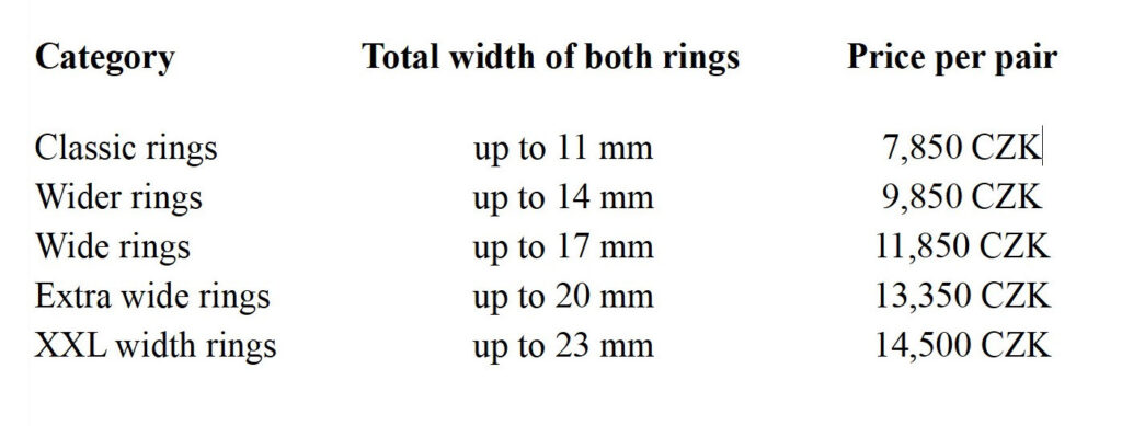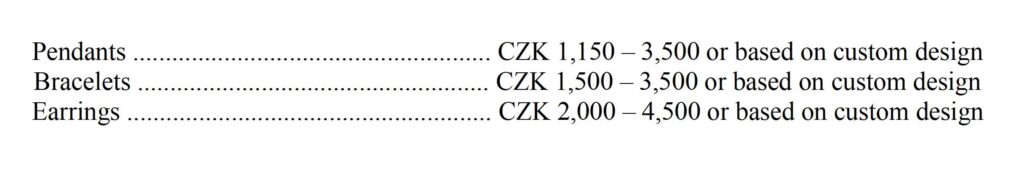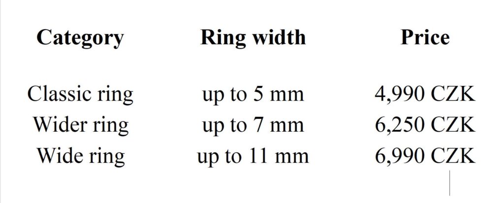 Pendants and other jewelry pieces start at CZK 1,150. Rings range in price from approximately CZK 3,500 to 6,500 each, depending on width, pattern, and other details. The upper end applies to extra-wide rings that are roughly the width of two standard ones. 🙂