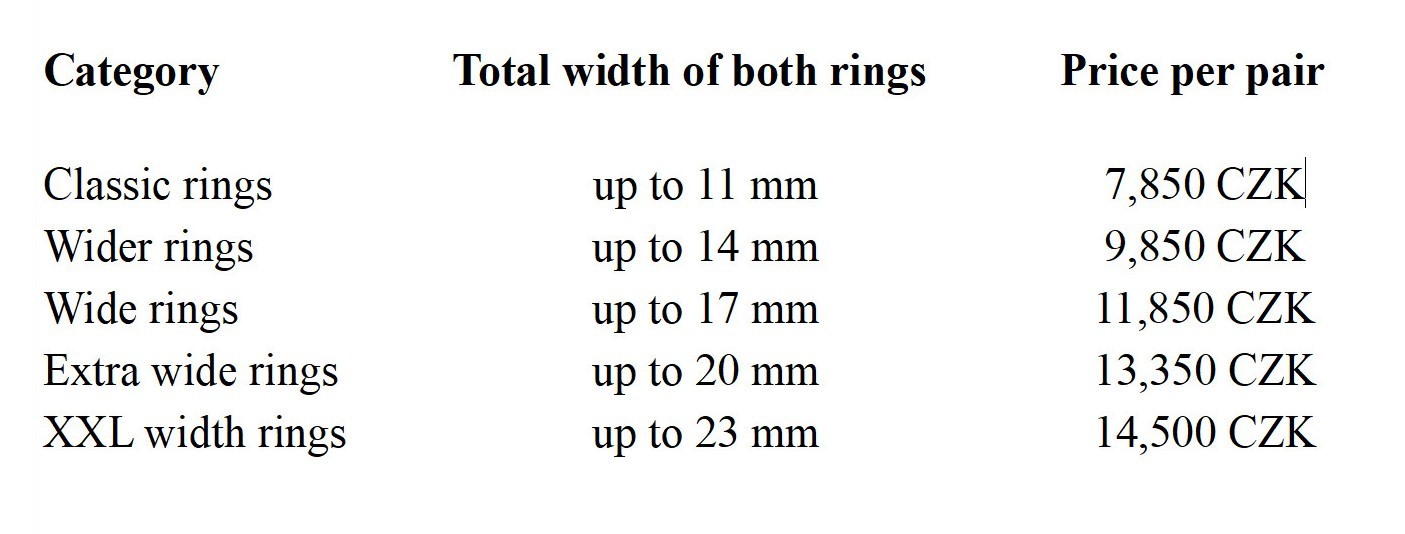To determine the price, simply add up the widths of both rings and find the corresponding total in the price table.