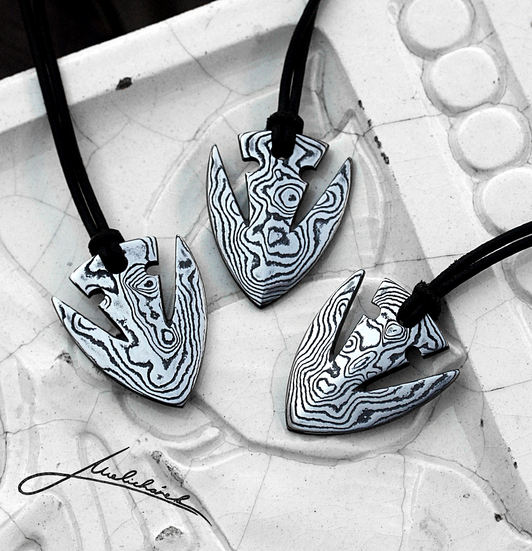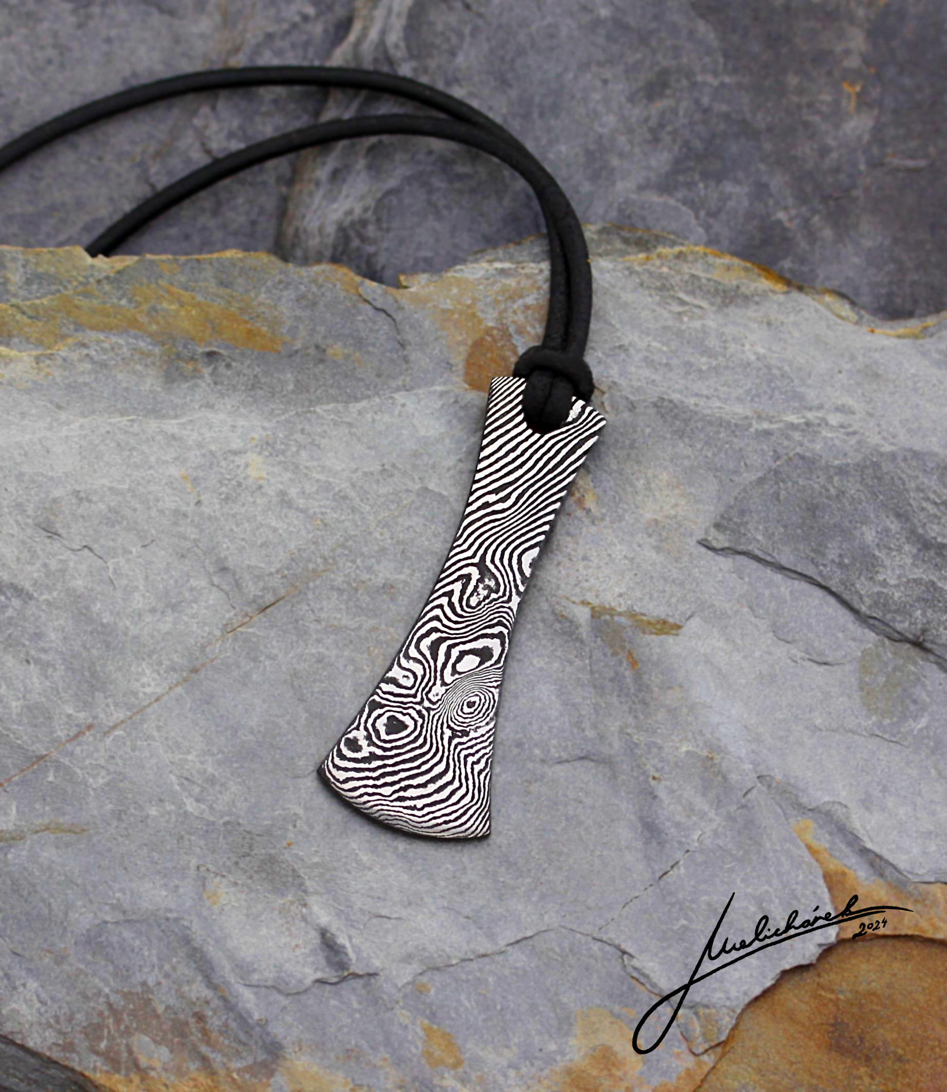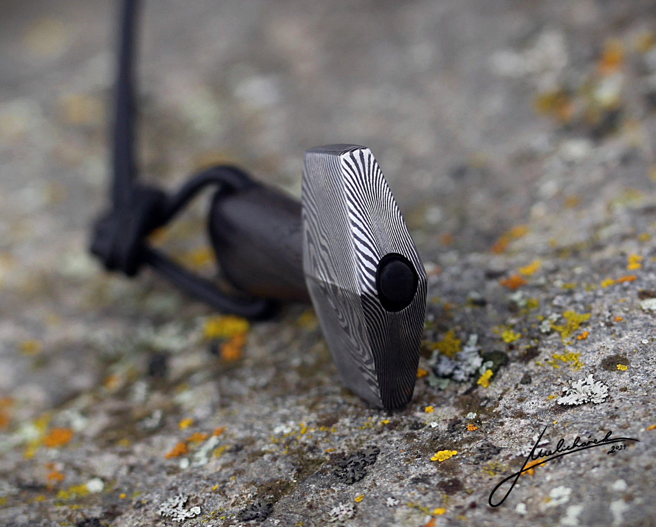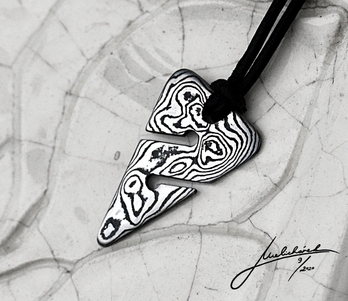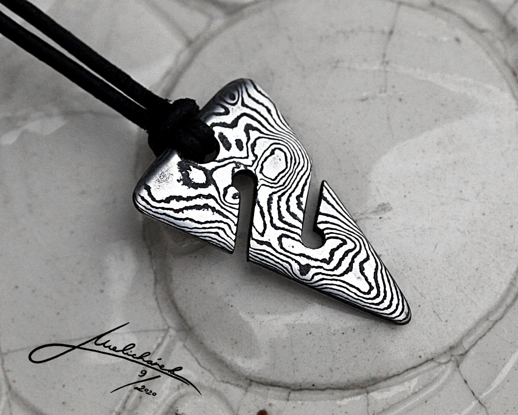 Přívěsek z nerezového damašku inspirovaný potápěčskou směrovou šipkou, která se používá při potápění v jeskyních nebo jiných nepřehledných prostorech. Pomůže Vám udržet správný směr na Vaší cestě 🙂