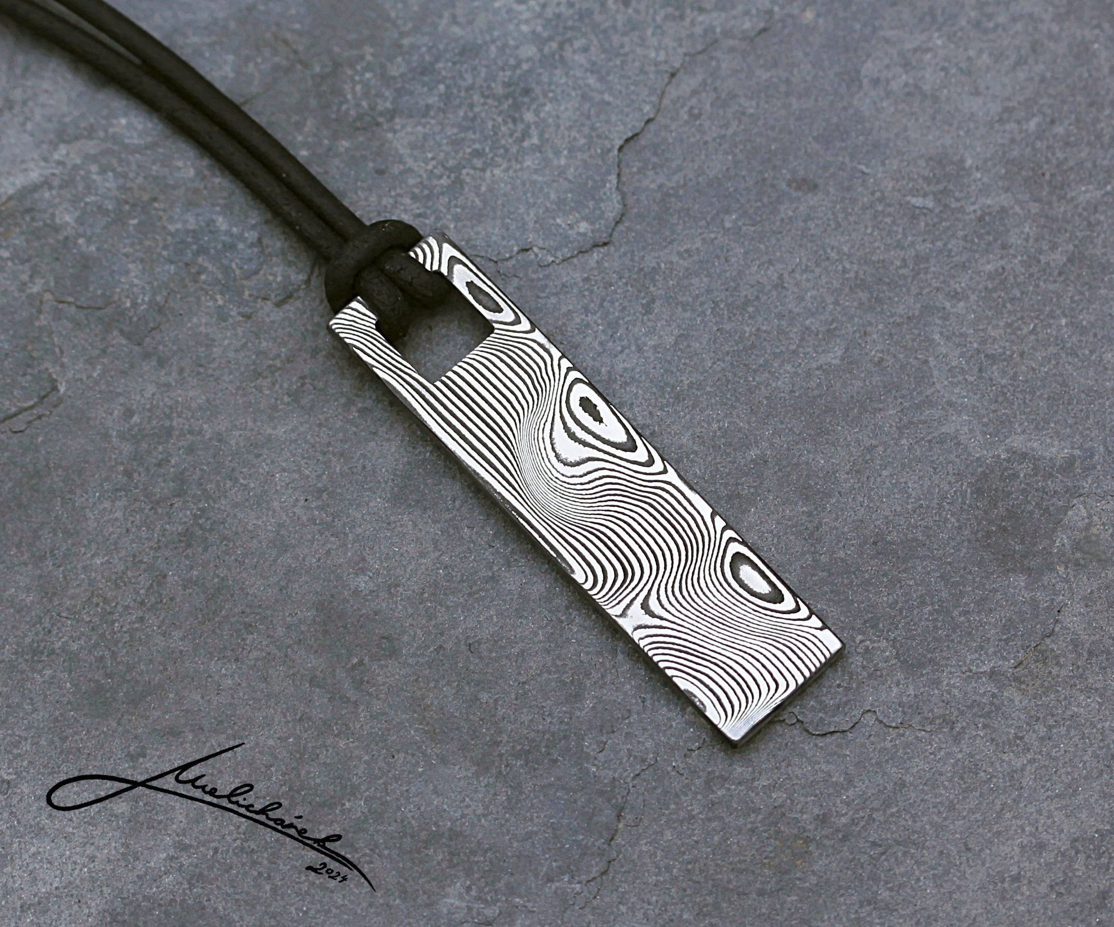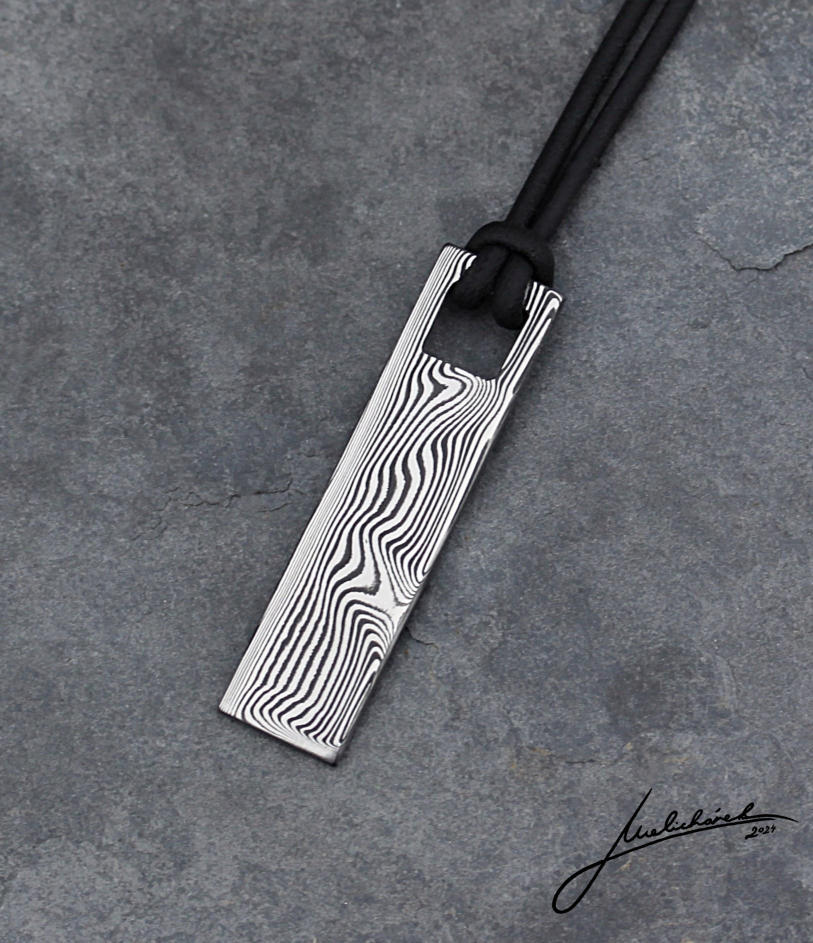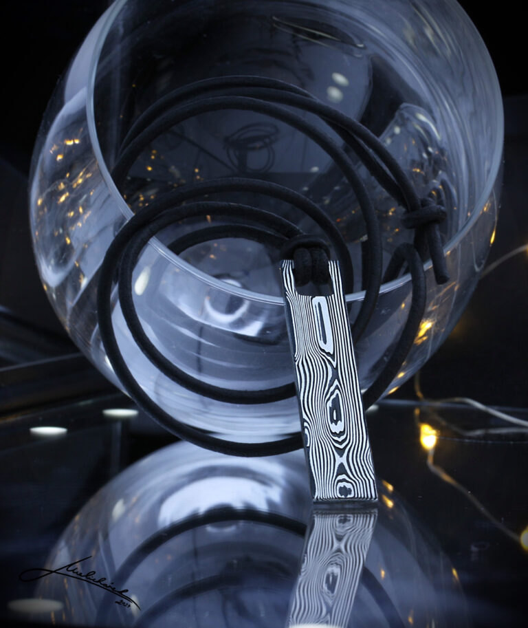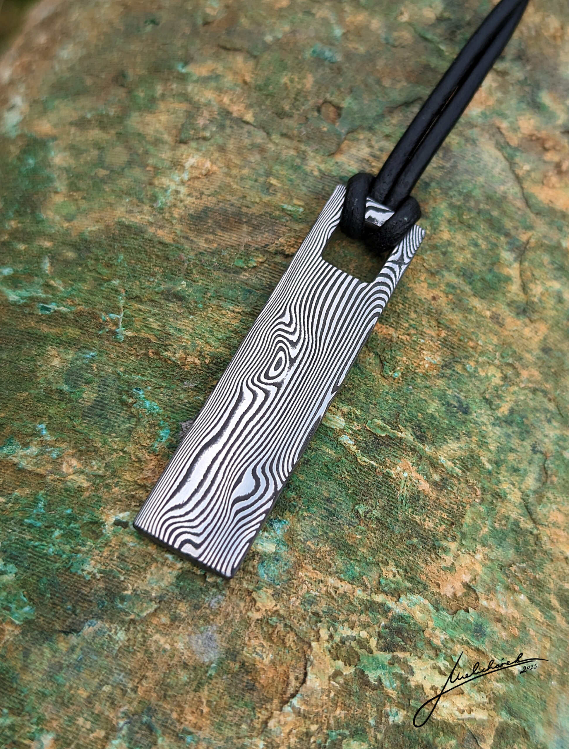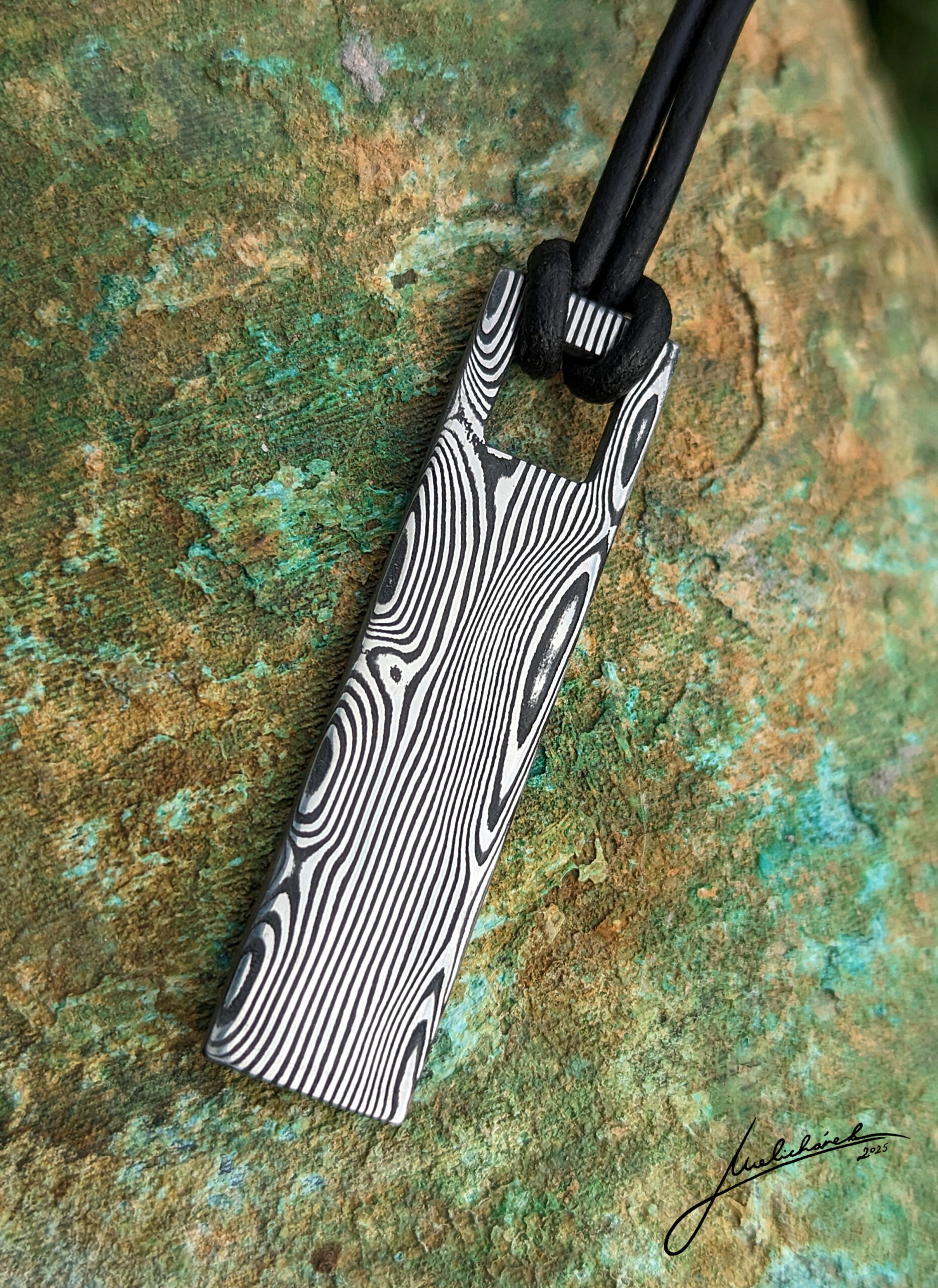 Přívěsek z nerezového damašku inspirovaný potápěčskou směrovou šipkou, která se používá při potápění v jeskyních nebo jiných nepřehledných prostorech. Pomůže Vám udržet správný směr na Vaší cestě 🙂