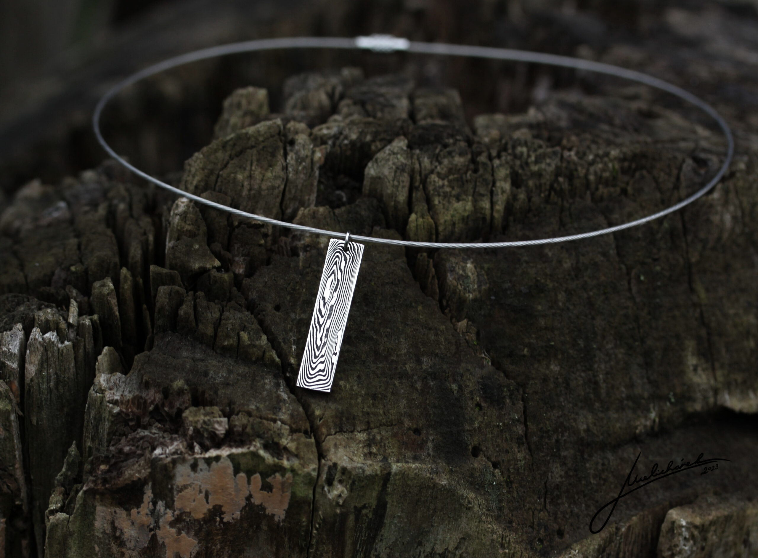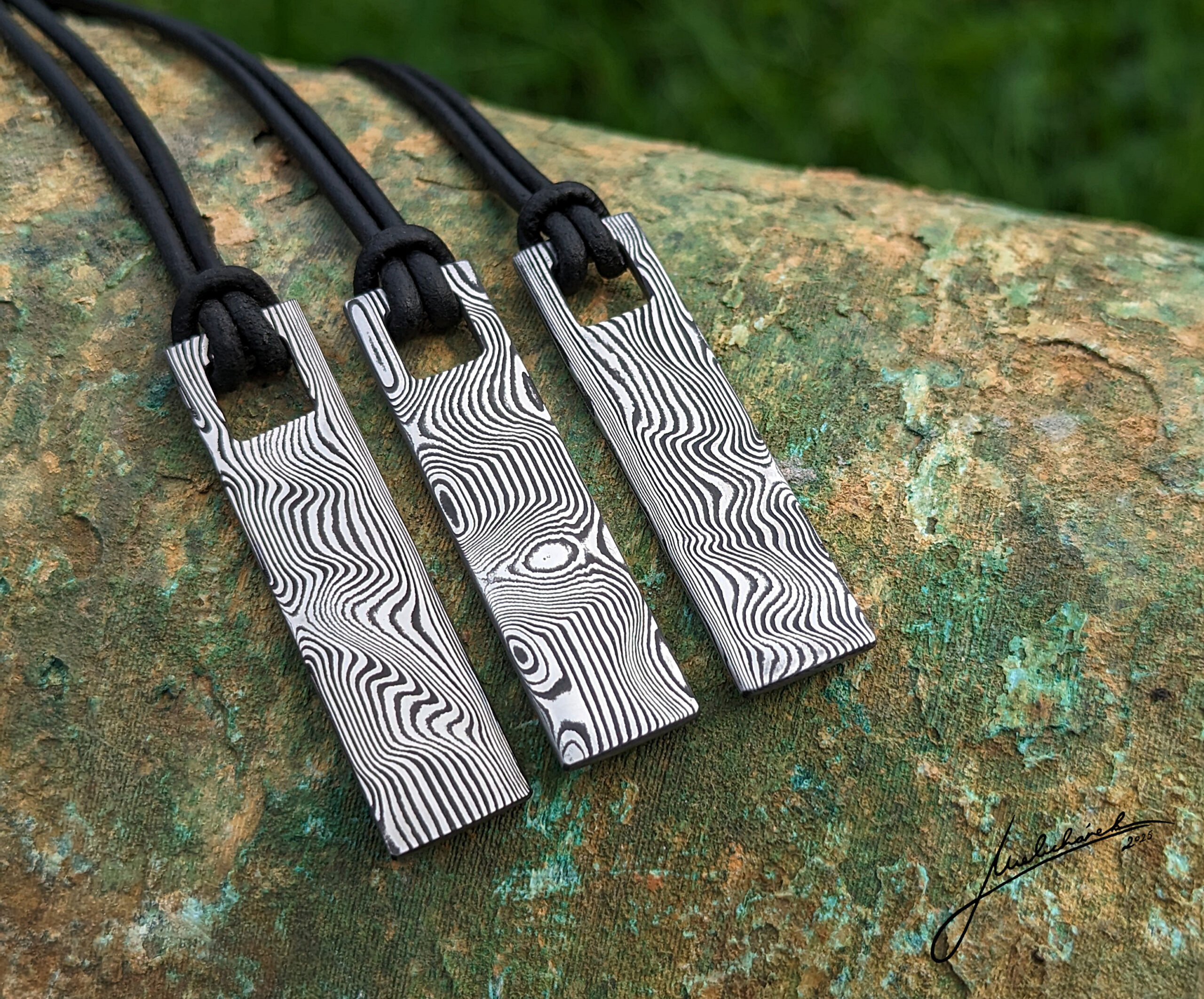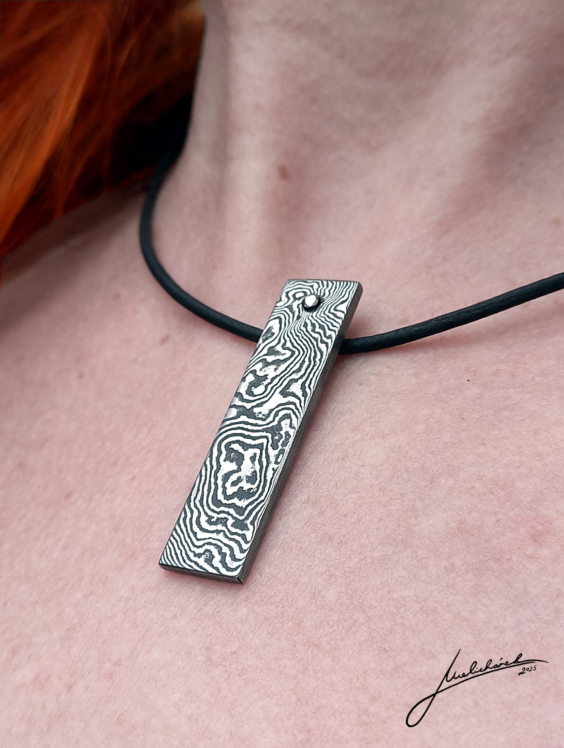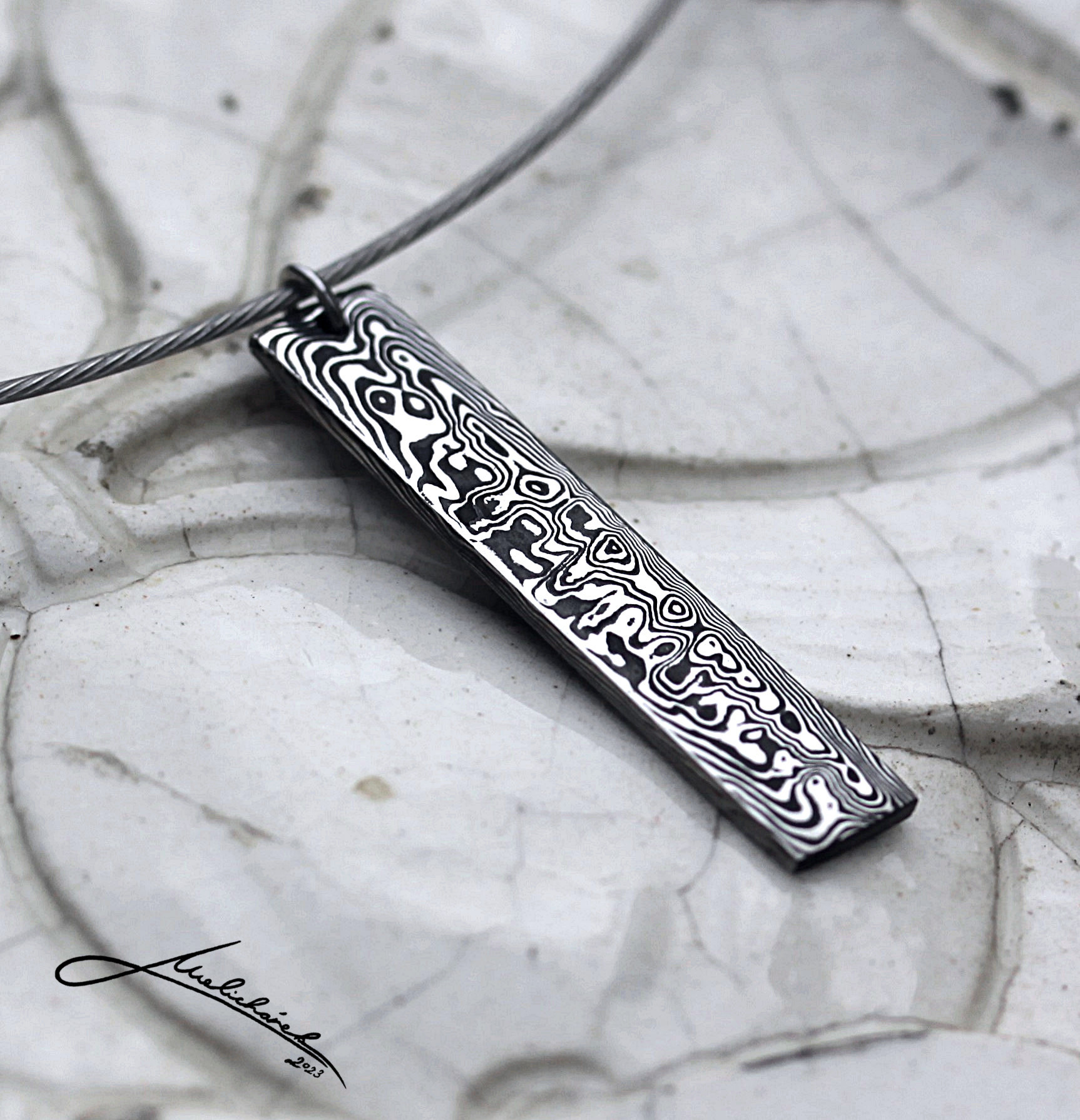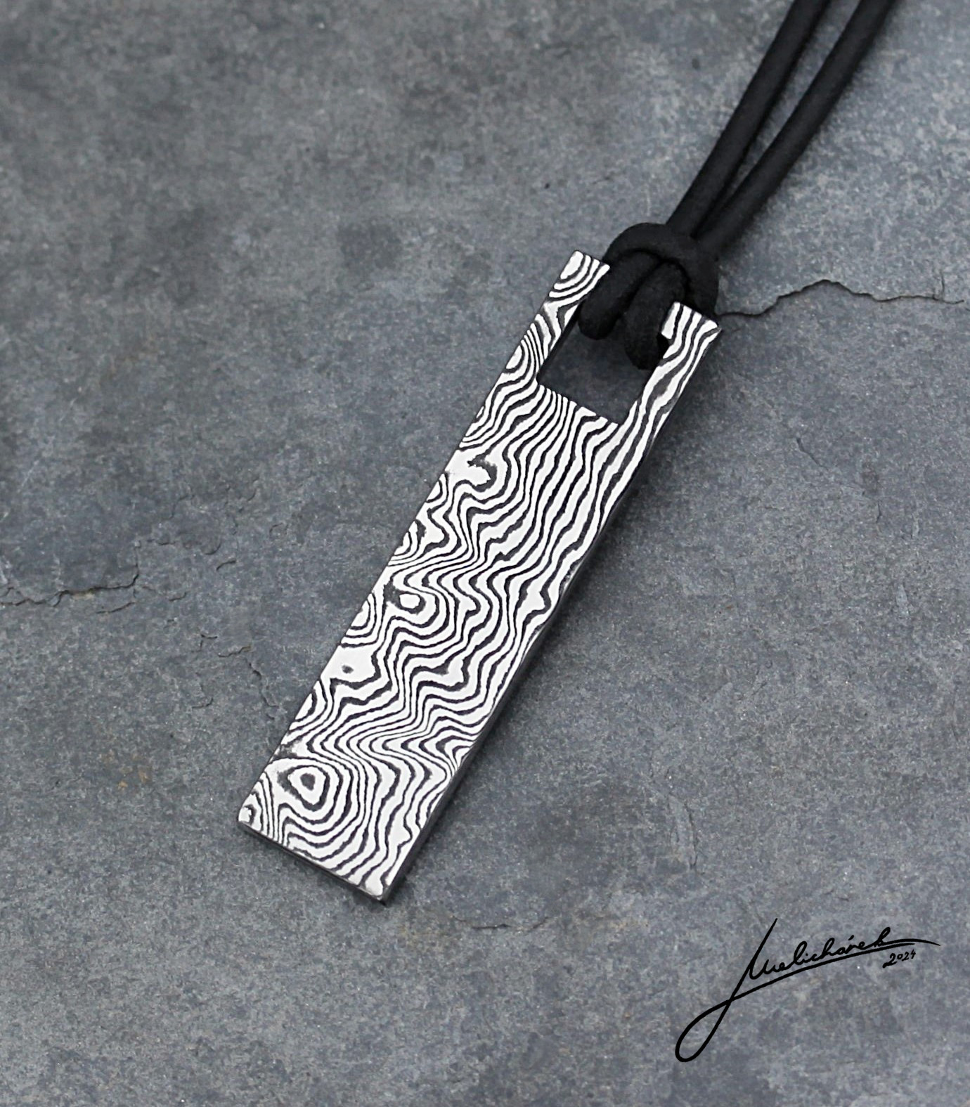 Přívěsek z nerezového damašku inspirovaný potápěčskou směrovou šipkou, která se používá při potápění v jeskyních nebo jiných nepřehledných prostorech. Pomůže Vám udržet správný směr na Vaší cestě 🙂