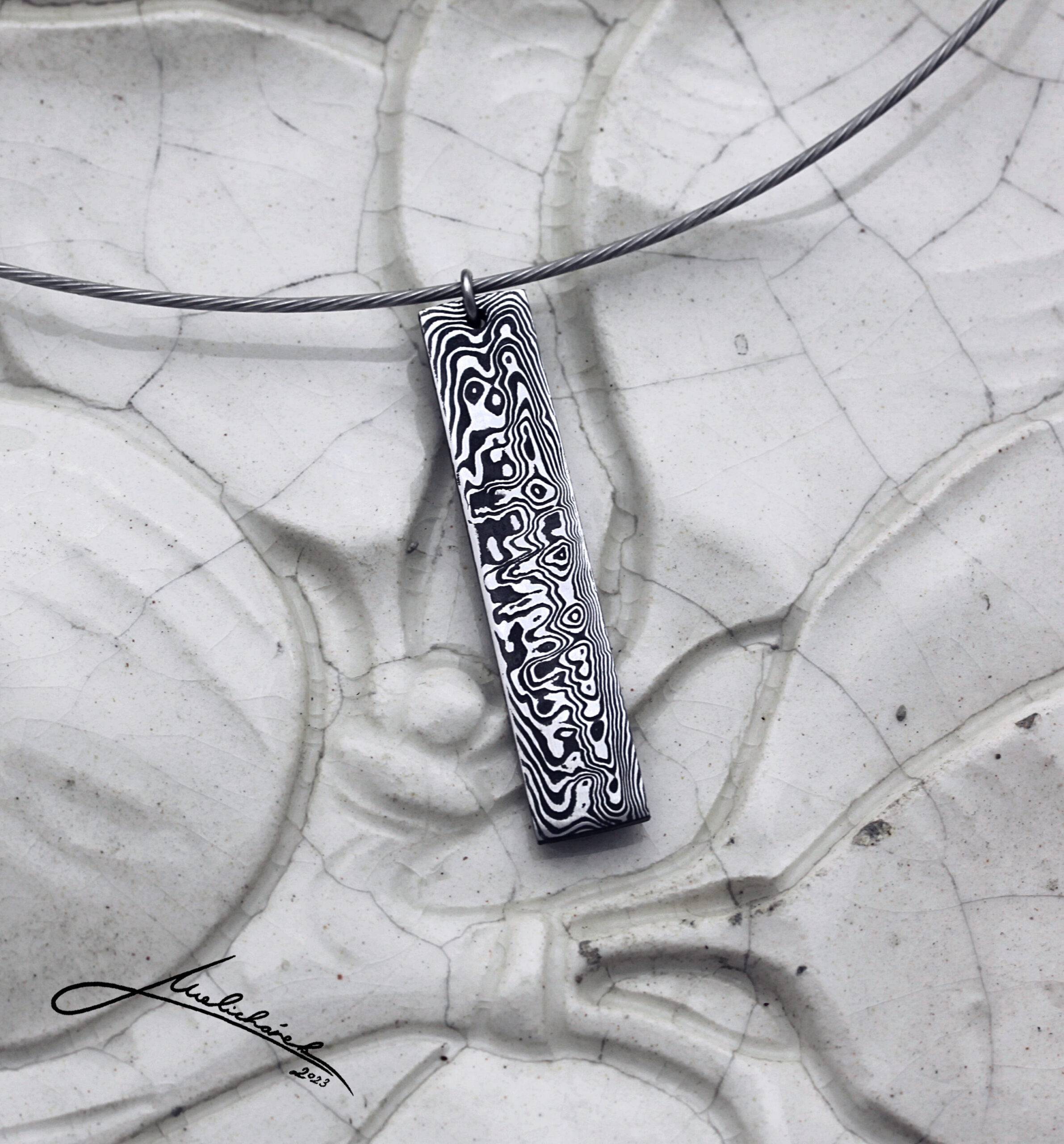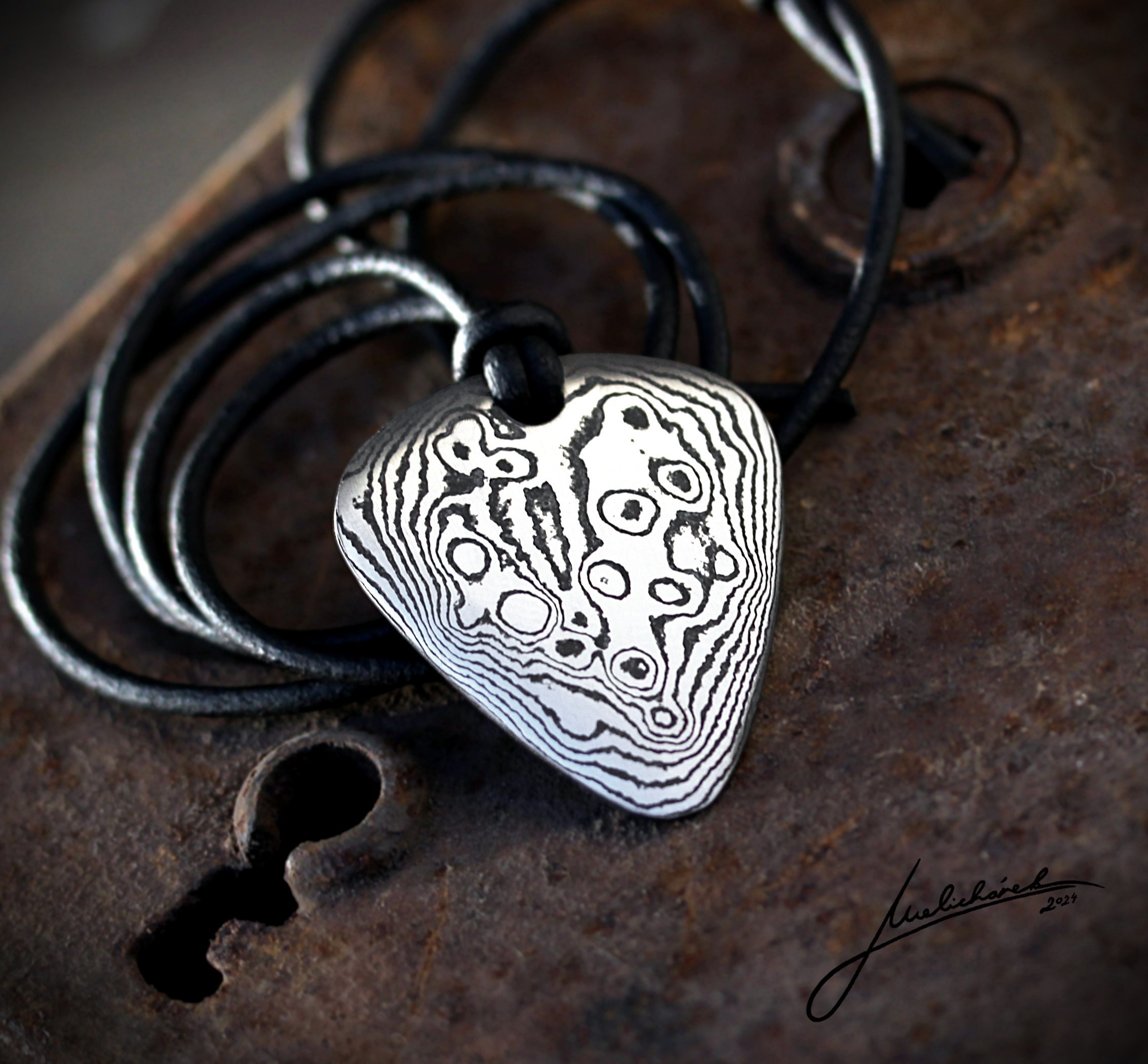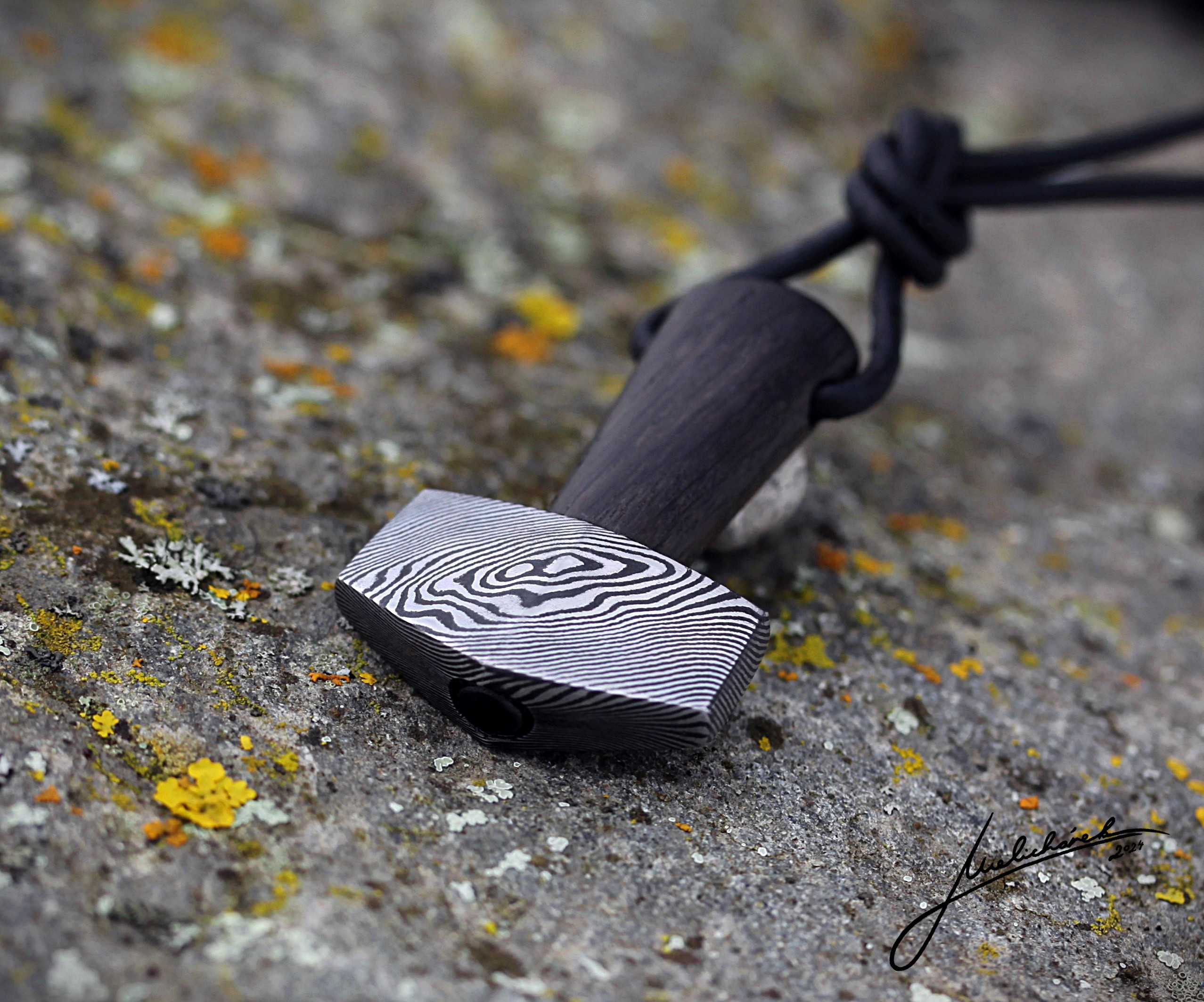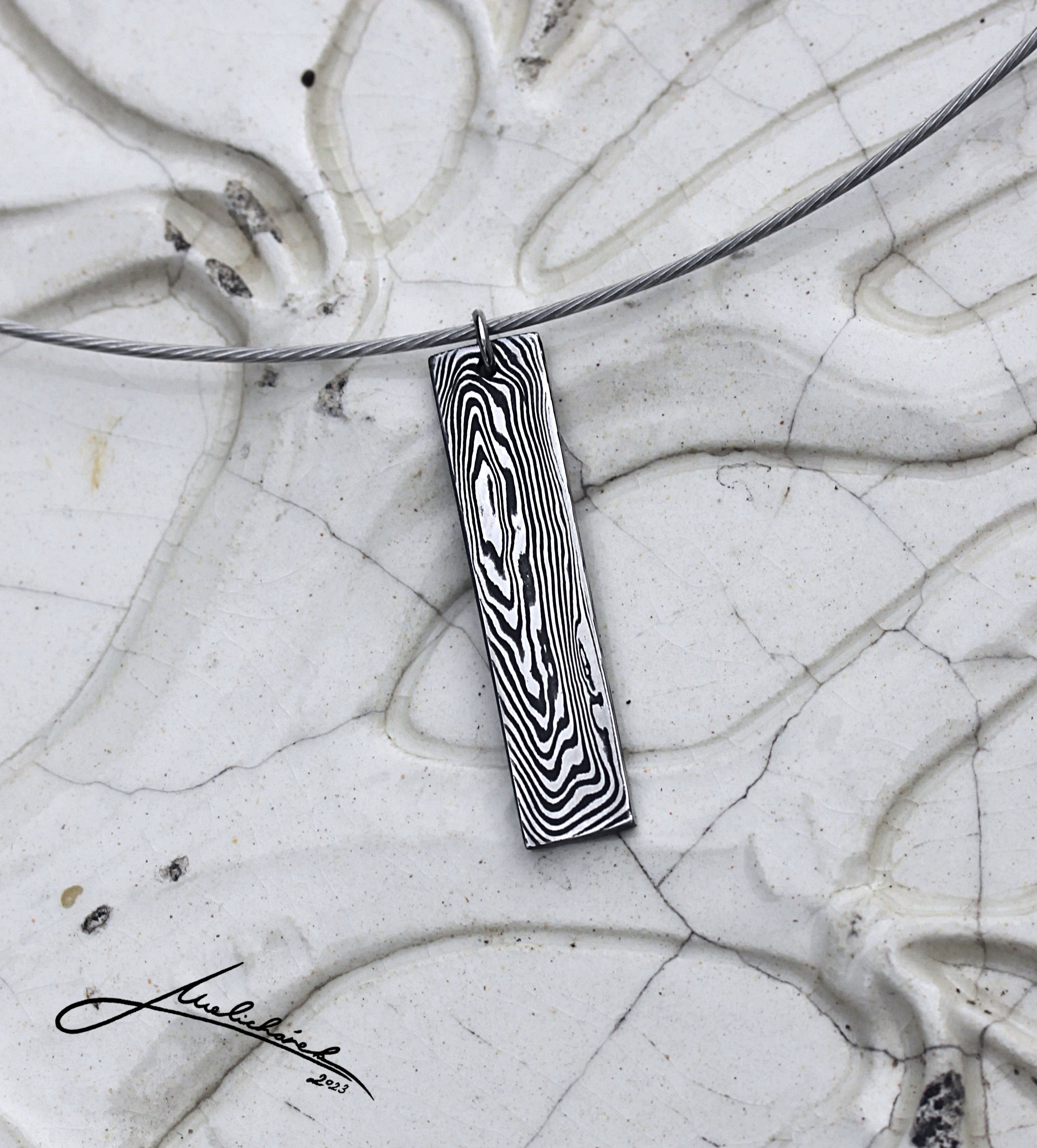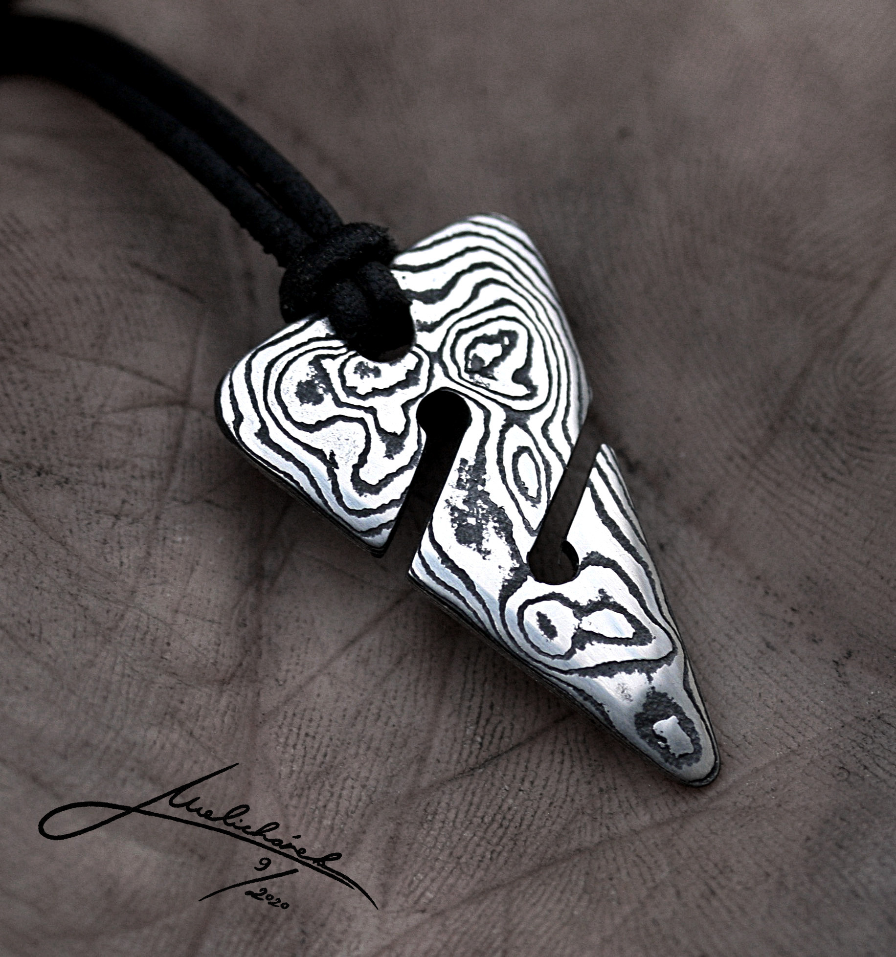 Přívěsek z nerezového damašku inspirovaný potápěčskou směrovou šipkou, která se používá při potápění v jeskyních nebo jiných nepřehledných prostorech. Pomůže Vám udržet správný směr na Vaší cestě 🙂