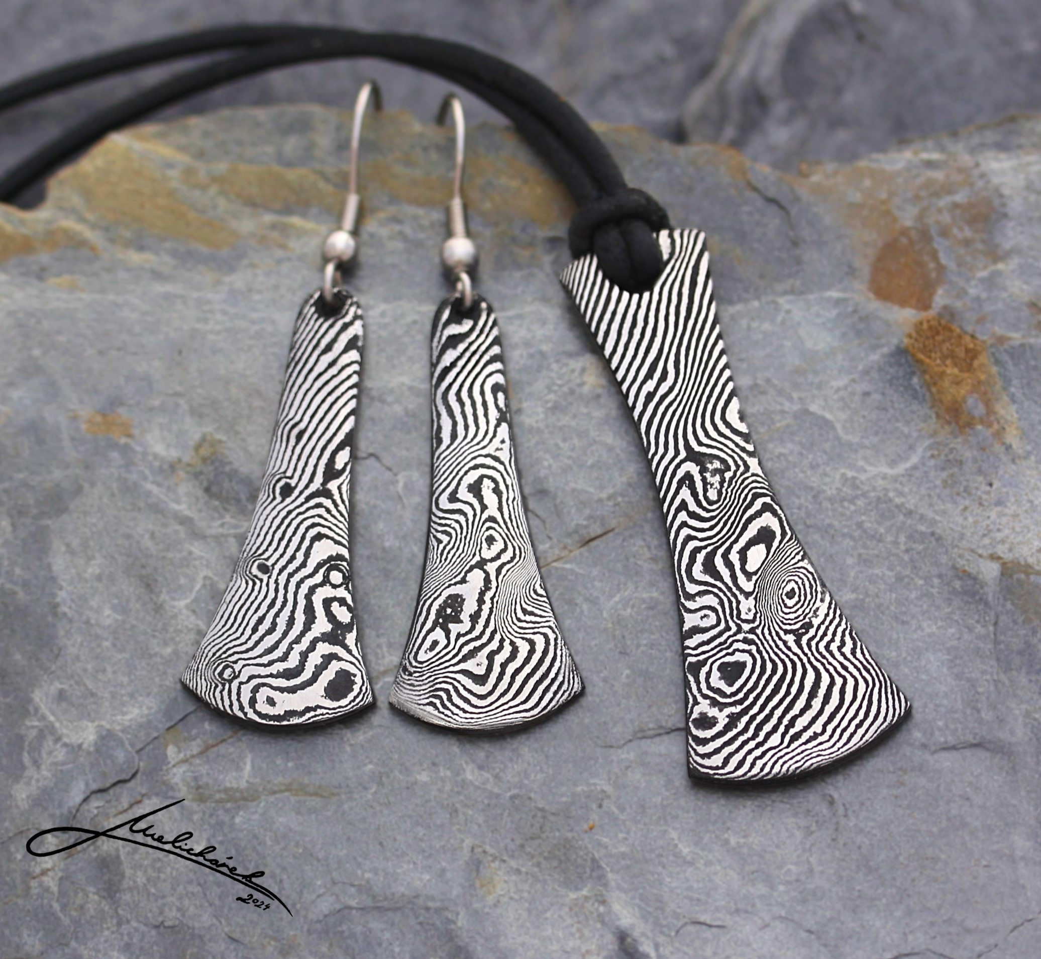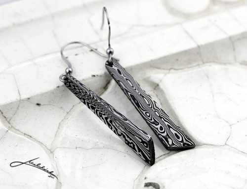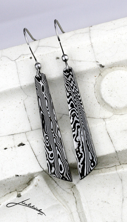 Výrazné náušnice z nerezového damašku ve tvaru „křídel vážky“. Tyto 40mm dlouhé náušnice nepatří k nejmenším, díky mírně vypouklému tvaru však působí vzdušně.