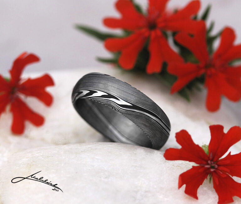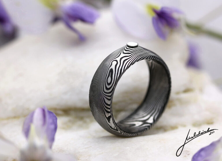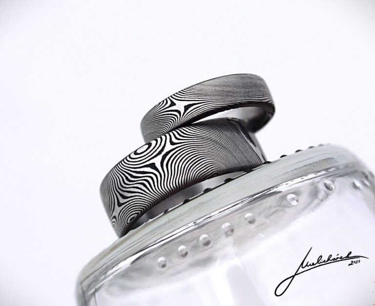 Damaškové vzory, zdobení a tvarování prstenů z oceli Damasteel.