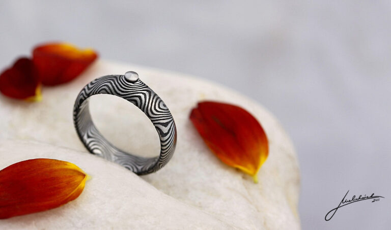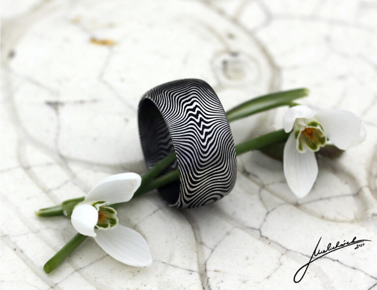 Druhá věc jsou pak různé ťukance a oděrky, které přirozeně vznikají na všech používaných předmětech. Ocel je sice považována za velmi pevný a odolný materiál, ale je potřeba počítat s tím, že stejně tvrdý nebo tvrdší materiál na ní vždy zanechá škrábanec nebo otlak a na damaškové struktuře je to pak vidět. Určitě není třeba se obávat, že by se kresba při běžném nošení nějak odřela do hladka a z prstenu úplně zmizela! Ale je dobré mít na paměti, že když třeba škrtnete prstenem o zeď nebo pokud šoupete rukou po hrubém zábradlí, zůstane na něm „značka“ – a s tím se nedá nic dělat.
