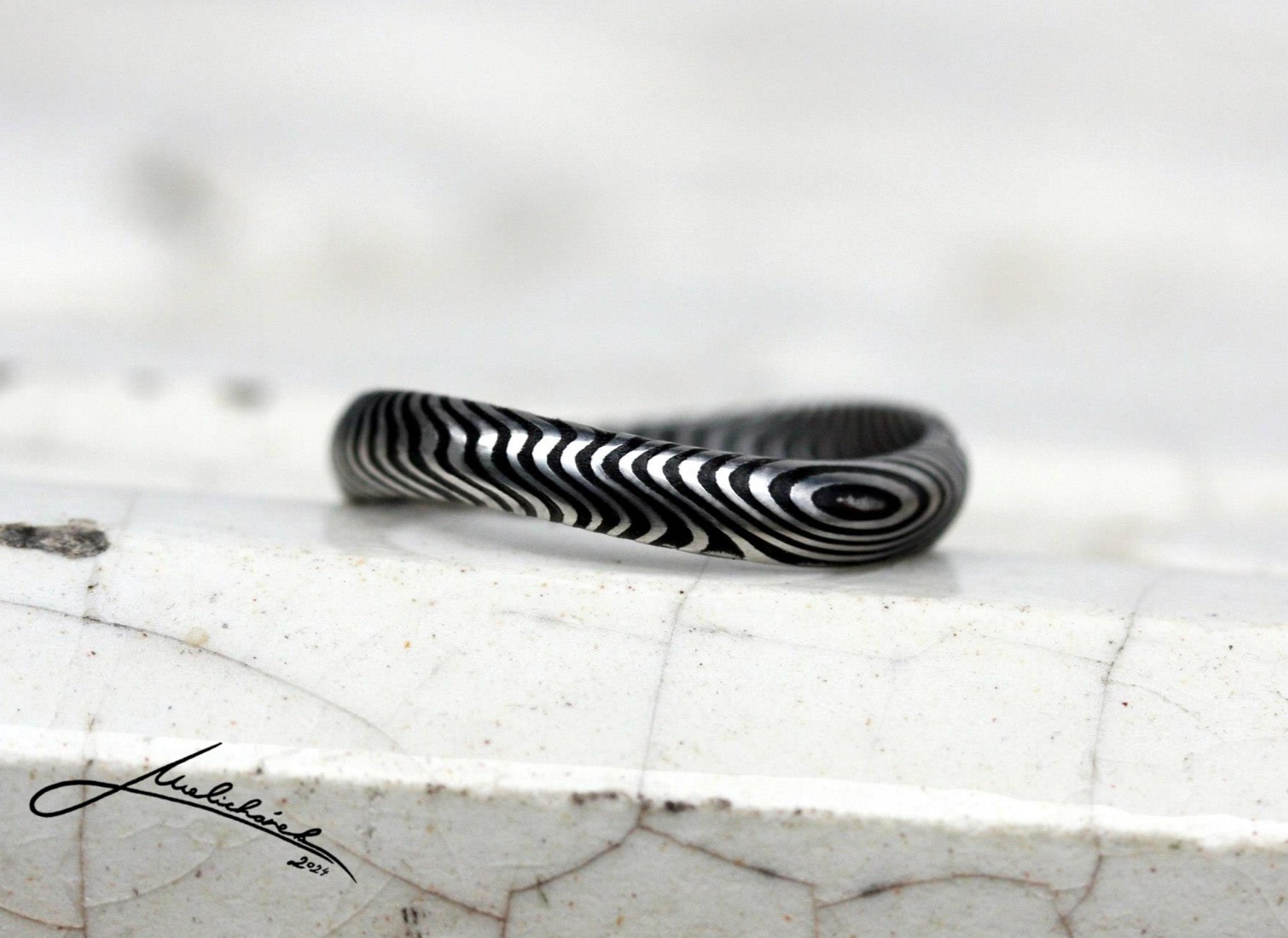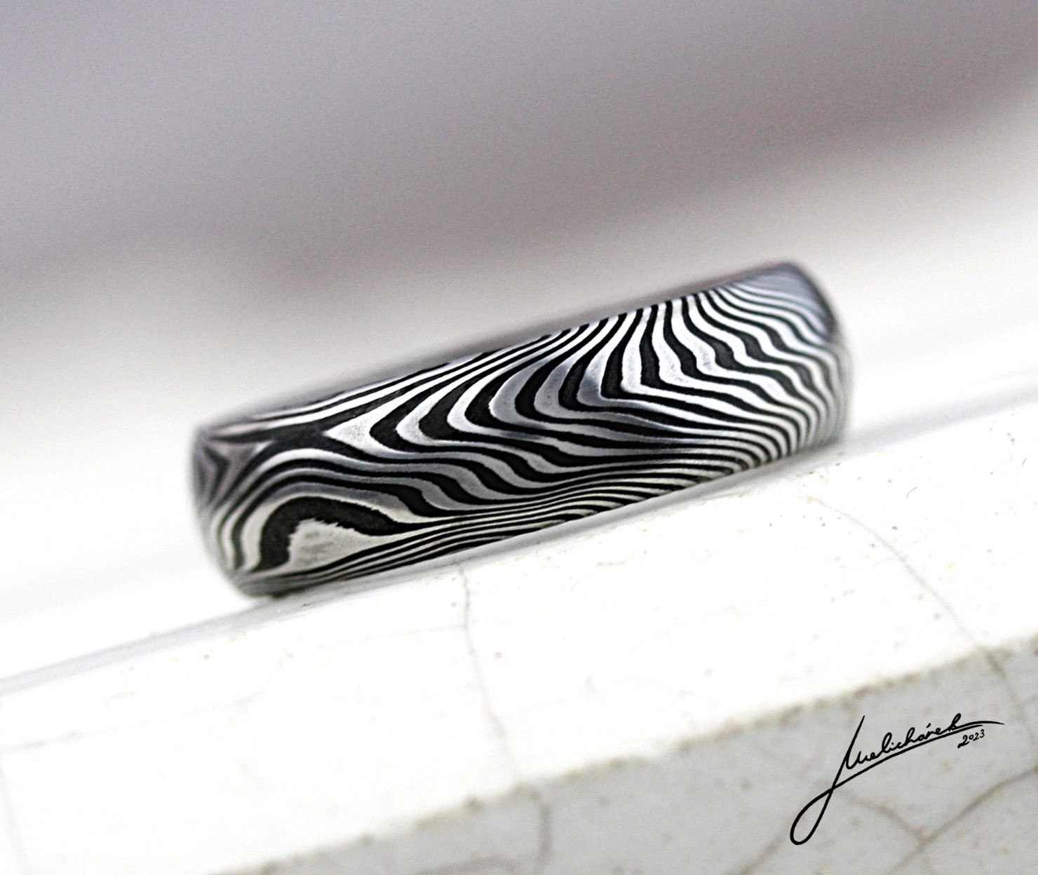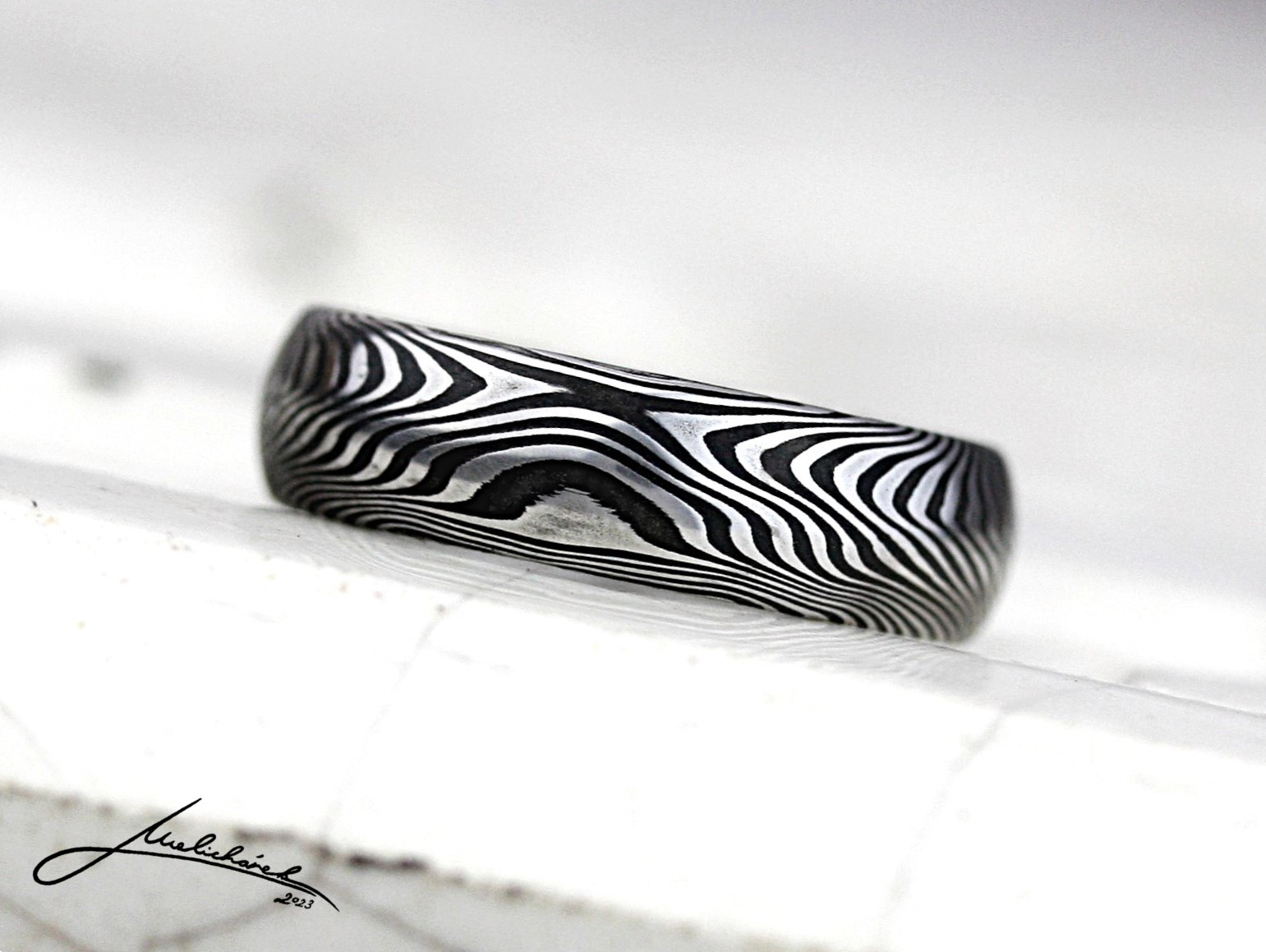 Vzor Wave je jeden z nejjemnějších vzorů, které používám. Kresba v podobě velmi drobných linek se šikmo obtáčí kolem prstenu a je zdůrazněná jednou výraznou, lehce zvlněnou linkou, která jde středem. Při větší šířce prstenů se středová linka „stihne“ obtočit dvakrát a kresba je pak výraznější. Tato kresba je opravdu velice jemná což se může za určitých okolností projevit na odolnosti proti poškozeni. Více viz sekce Výběr prstenů.